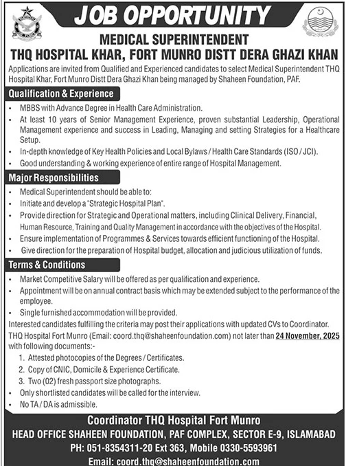 THQ Hospital Khar, Fort Munro, is managed by the Shaheen Foundation, PAF. Applications are invited from qualified and experienced professionals for the position of Medical Superintendent.
