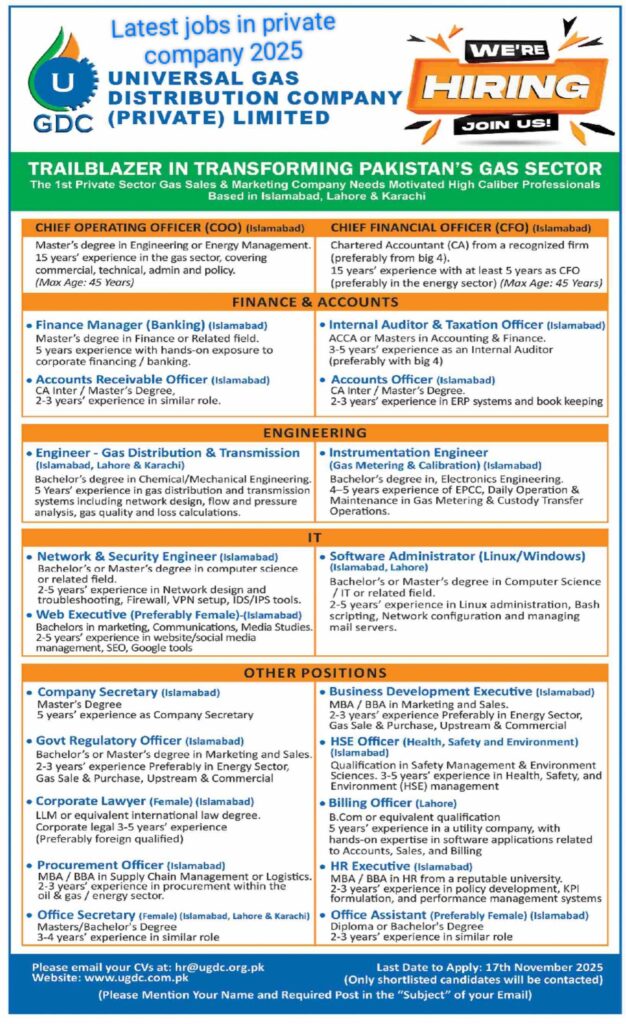 The first private sector gas sales and marketing firm in Pakistan, Universal Gas Distribution firm (Private) Limited (UGDC), is looking to add dynamic, driven, and excellent experts to its expanding team.